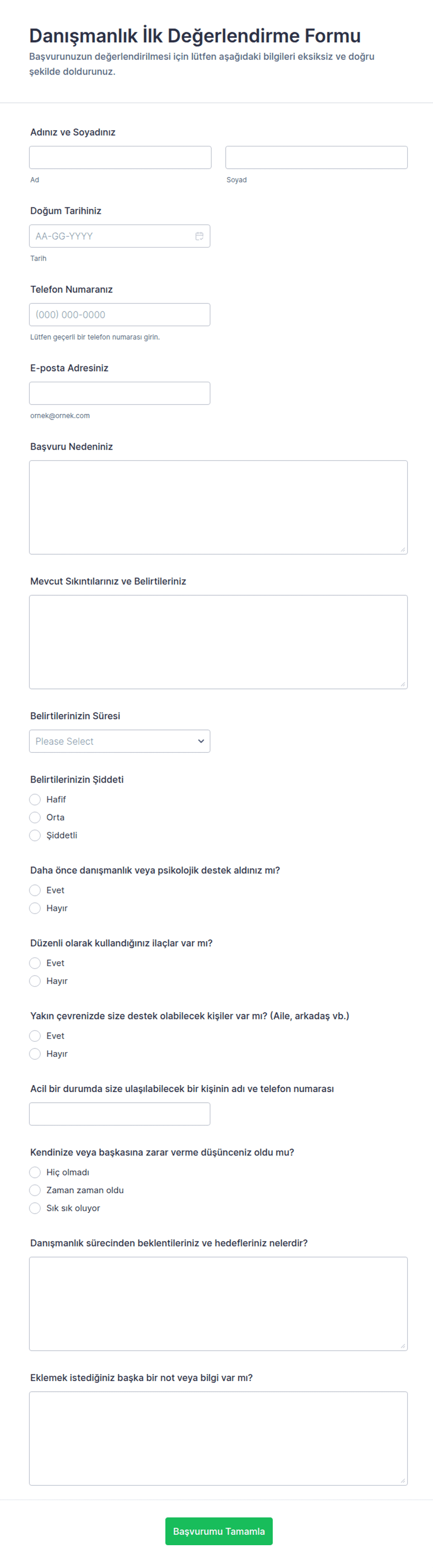 Danışmanlık Ön Görüşme Formu, psikologlar, koçlar ve danışmanlar için yeni danışanlardan temel bilgileri ve beklentileri toplayarak ilk görüşme öncesi ön değerlendirme sürecini düzenlemeye yardımcı olur.