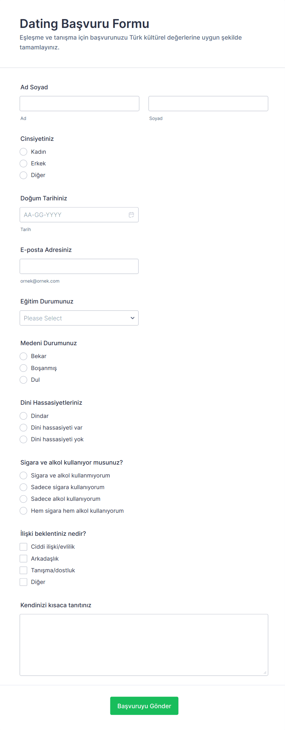Kişisel formlar, bireysel kullanım için tasarlanmış çok yönlü dijital araçlardır; kişilerin çok çeşitli günlük ihtiyaçları için kişisel bilgileri toplamasına, düzenlemesine ve yönetmesine yardımcı olur. İster fitness hedeflerini takip ediyor, etkinlik planlıyor, ev envanterlerini yönetiyor, ister arkadaşlardan ve aileden geribildirim topluyor olun, kişisel formlar, veri toplama ve düzenleme sürecini kolaylaştırır. Yaygın kullanım alanları arasında iletişim formları, kişisel bütçe takip formları, seyahat planları, sağlık ve zindelik kayıtları, LCV formları ve hatta hobi veya proje takip formları yer alır. Bu formlar, günlük rutinlerini basitleştirmek, kayıt tutmak veya kişisel hayatlarında iletişimi kolaylaştırmak isteyen herkes için idealdir.
