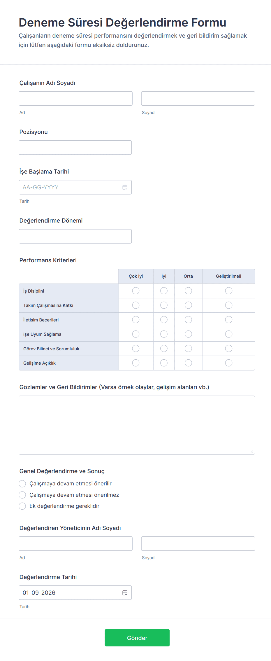 Deneme Süresi Değerlendirme Formu