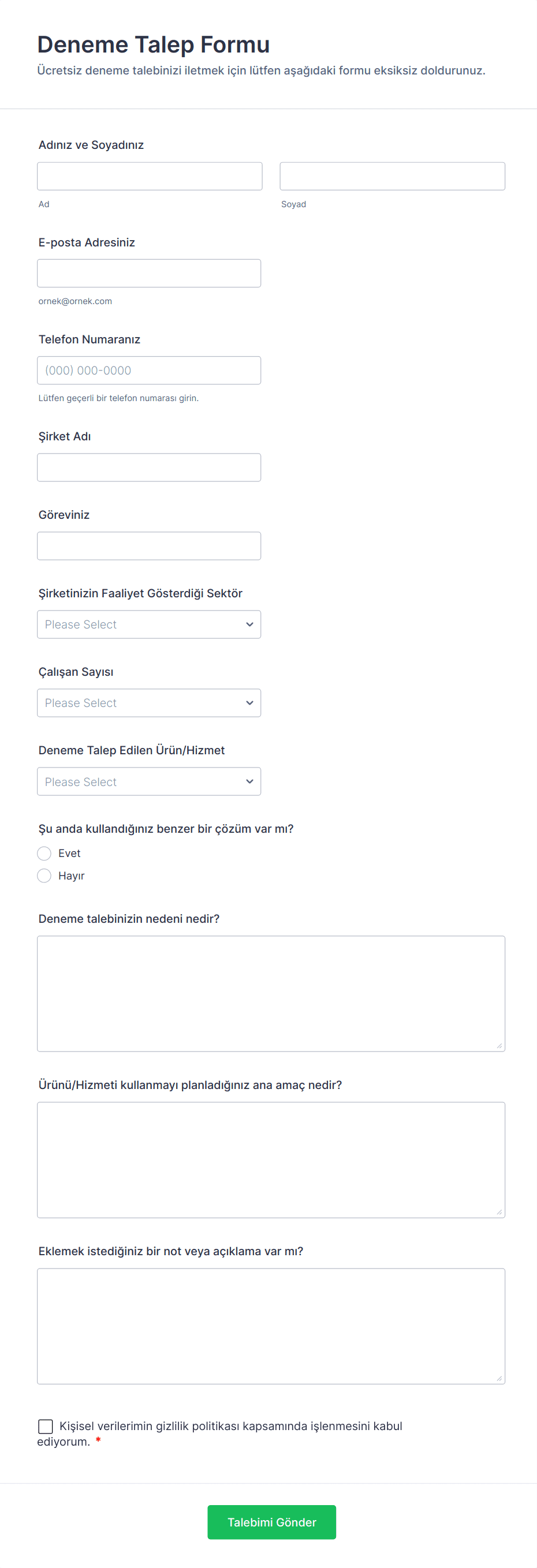 Topladığınız bilgiler hedeflerinize bağlıdır ancak yaygın kullanılan alanlar arasında ad, e-posta adresi, telefon numarası, şirket, iş unvanı ve ürün veya hizmetinizle ilgili özel sorular bulunur.
