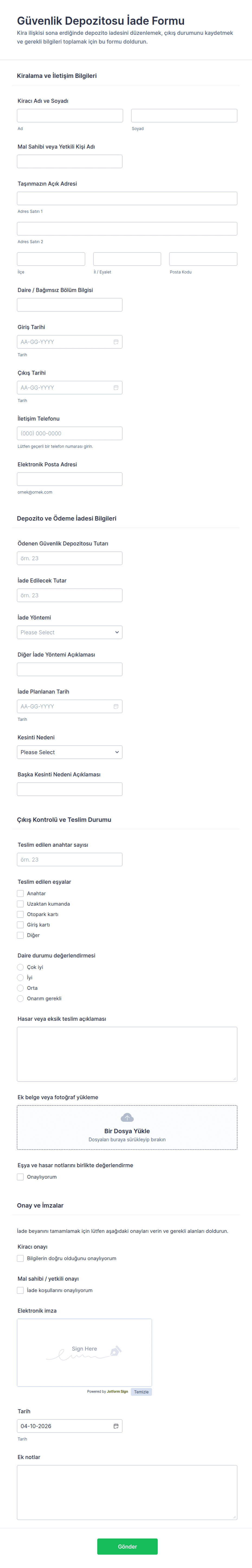 Güvence Bedeli İade Talep Formu, kira depozitosu iade taleplerini online olarak toplamak ve takip etmek isteyen emlak ofisleri, mülk yöneticileri ve site yönetimleri için düzenli veri toplama sağlar.