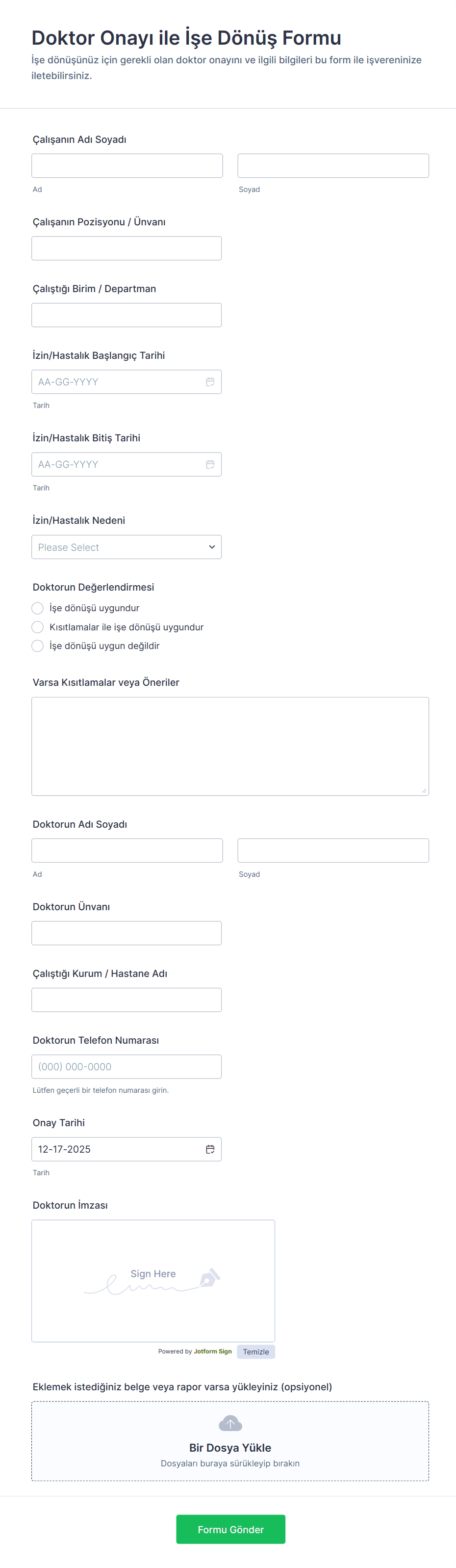 Bu adımları takip ederek, kuruluşunuzun özel ihtiyaçlarını karşılayan, işe dönüş sürecini kolaylaştıran ve tüm gerekli bilgilerin güvenli ve verimli bir şekilde toplanmasını sağlayan bir İşe Dönüş Formu oluşturabilirsiniz.