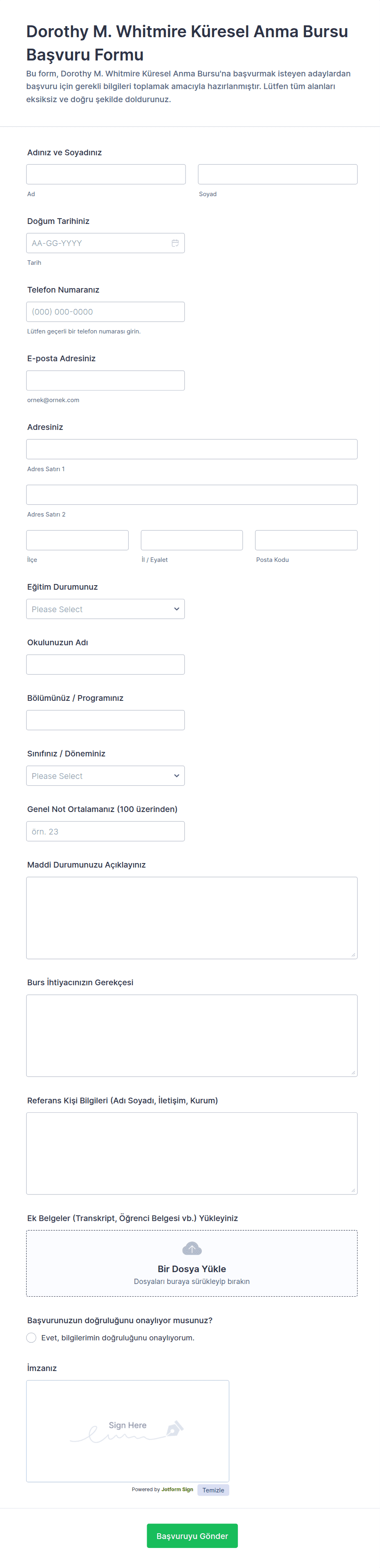 Özetle, burs başvuru formları, kuruluşların kendi benzersiz seçim kriterleri için doğru bilgileri toplamalarını sağlayacak şekilde çok çeşitli senaryolara uyacak biçimde özelleştirilebilir.