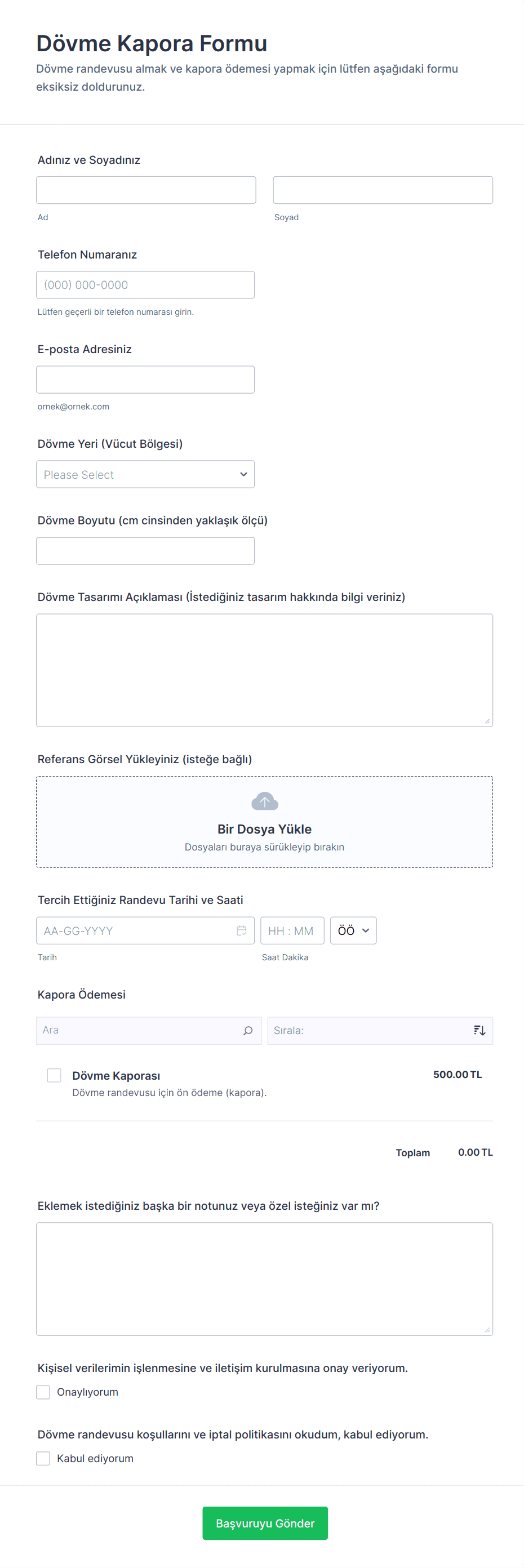 Dövme Kapora Formu, randevu öncesi kapora sürecini netleştirmek, müşteri bilgilerini tek yerde toplamak ve randevu planlamasını daha düzenli yürütmek için kullanılır.