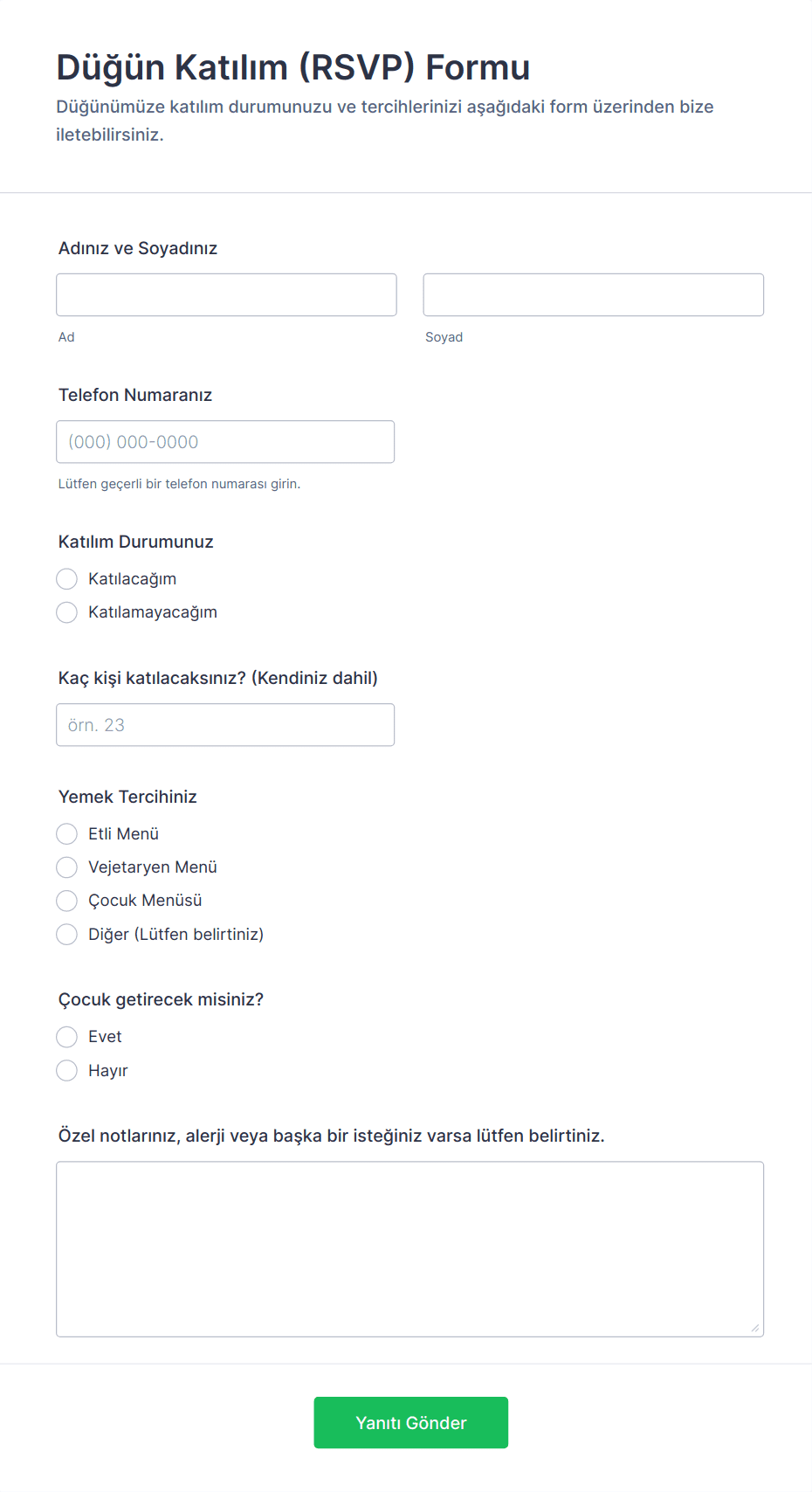 - Resmi etkinlikler (örneğin, düğünler) için formlarda yemek seçimleri, yanınızda getireceğiniz kişiler ve kişiselleştirilmiş mesajlar için alanlar bulunabilir.