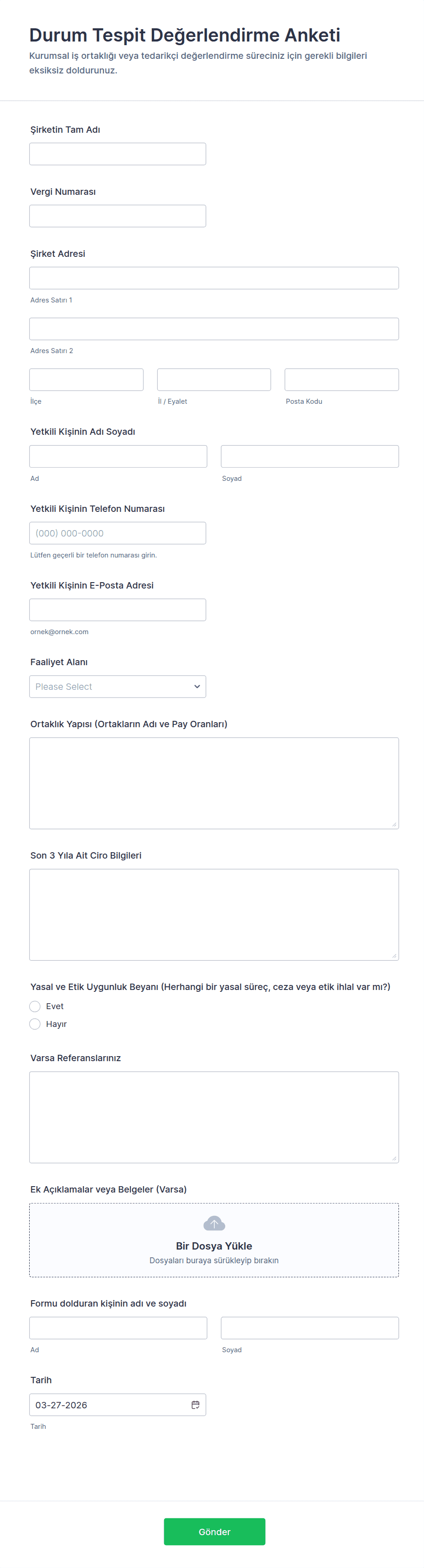 Değerlendirme Formu Şablonları, çeşitli ortamlarda bilgi, beceri, performans veya diğer kriterleri değerlendirmek, ölçmek veya analiz etmek için kullanılan önceden tasarlanmış dijital formlardır. Bu şablonlar, eğitimde öğrenci değerlendirmeleri için, işyerinde çalışan değerlendirmeleri için, sağlık hizmetlerinde hasta taramaları için ve yapılandırılmış geri bildirimin veya veri toplama sürecinin gerekli olduğu diğer birçok alanda yaygın olarak kullanılmaktadır. Değerlendirme formları, basit quizlerden ve öz değerlendirmelerden karmaşık çok bölümlü değerlendirmelere kadar uzanabilir ve bu da onları eyleme geçirilebilir içgörüler elde etmek ve karar verme süreçlerini desteklemek için çok yönlü araçlar haline getirir.
