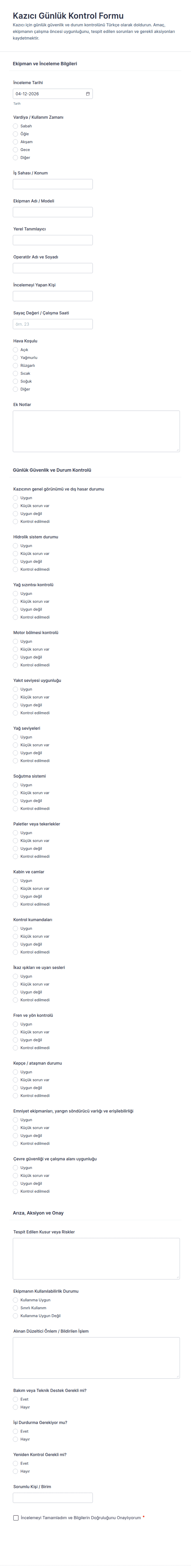 Yükleme Öncesi Kontrol Listesi Formu, lojistik ve depo ekiplerinin yükleme başlamadan önce güvenlik ve ekipman kontrollerini kayıt altına alarak veri toplama sürecini daha tutarlı yönetmesine yardımcı olur.
