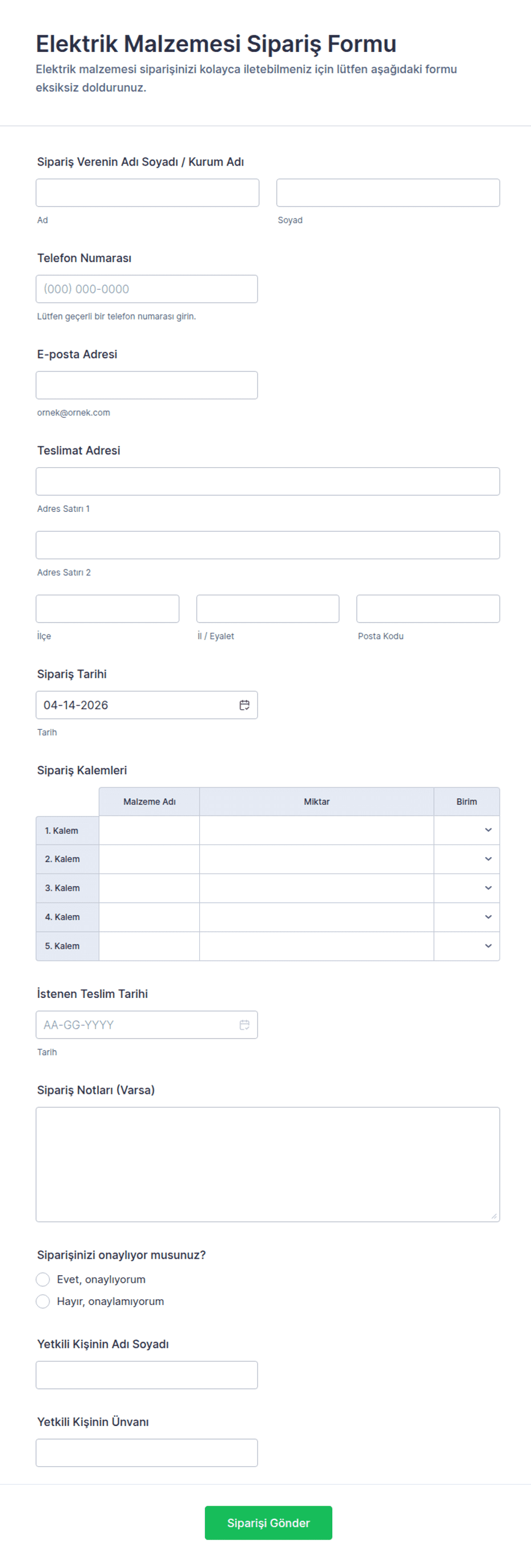 Bu adımları takip ederek tedarik sürecini kolaylaştıran, hataları azaltan ve malzeme yönetimi sürecinizi düzenli ve verimli tutan bir Malzeme Sipariş Formu oluşturabilirsiniz.