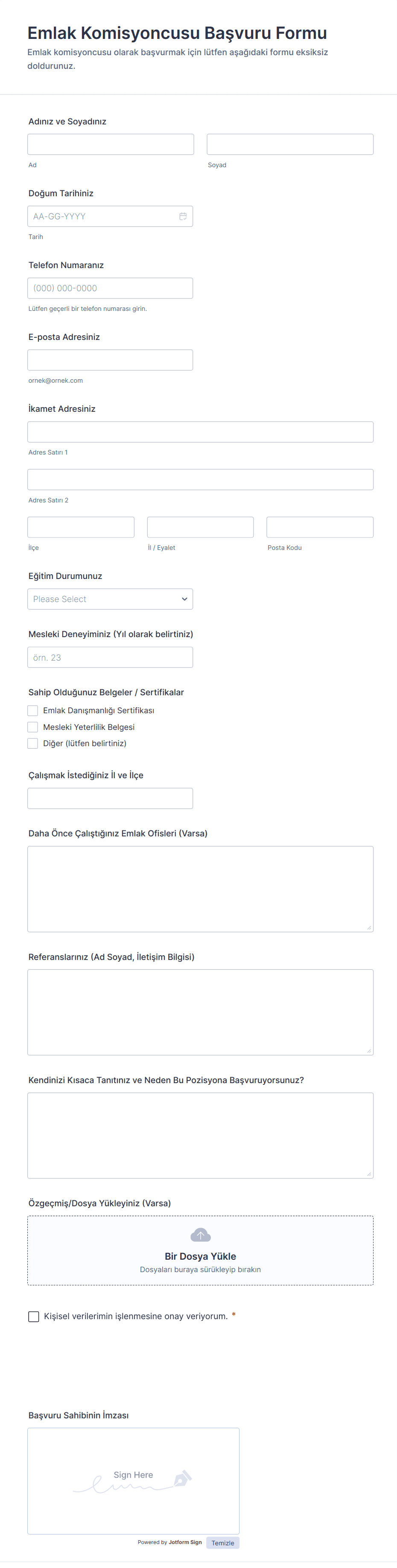 Emlak Komisyoncusu Başvuru Formu, adaylardan gerekli bilgileri tek bir kanalda toplayarak değerlendirme sürecini daha tutarlı hale getirmek ve veri toplama sırasında eksik bilgi riskini azaltmak için kullanılır.