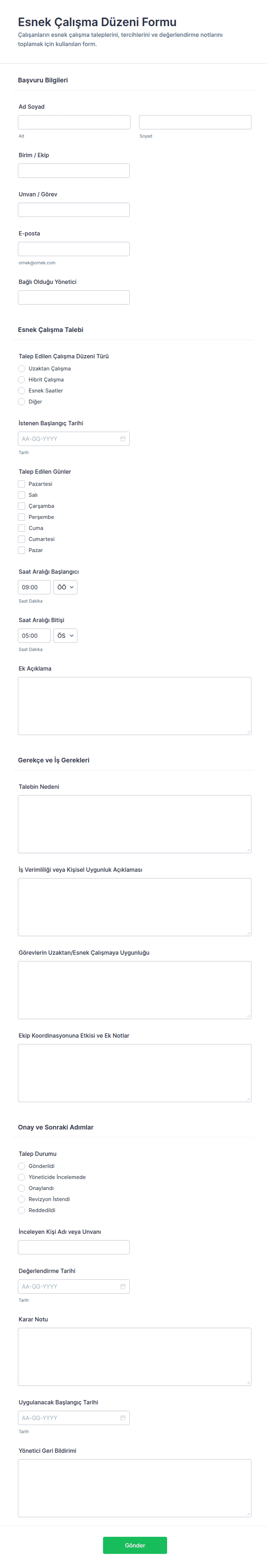 - İçerik ve alanlar kullanım durumuna göre değişir: bir ekipman talep formu eşya detayları ve gerekçe içerebilirken, bakım talep formu konum ve sorun açıklaması gerektirebilir
