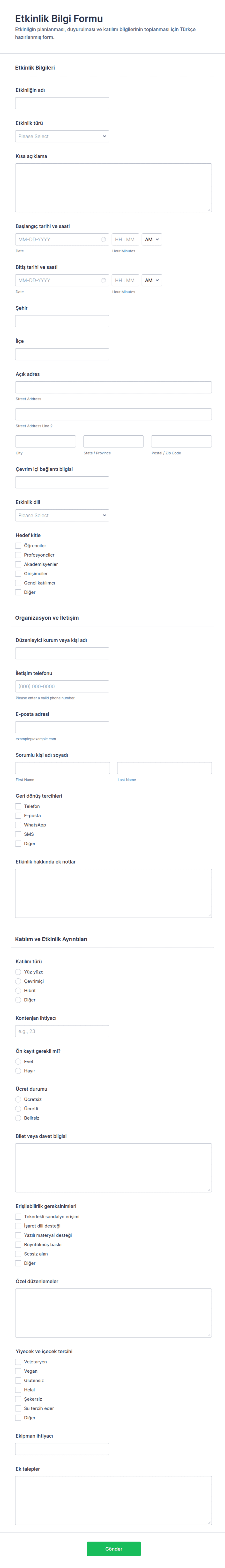 - Sanal veya hibrit etkinlik talep formları platform seçimini, yayın ihtiyaçlarını, kayıt gereksinimlerini, konuşmacı koordinasyonunu ve teknik destek detaylarını önceliklendirir.