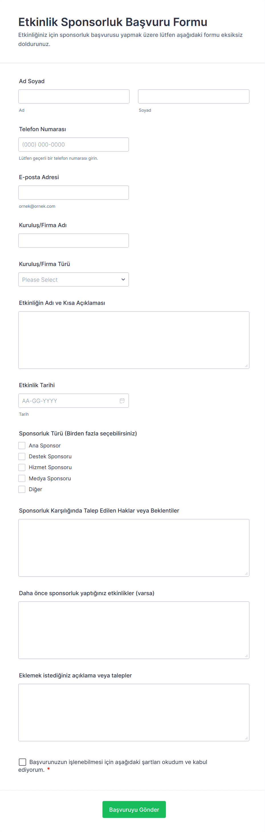 Sponsorluk başvuru formları, sponsorlardan finansal veya ayni destek arayan kuruluşlar, etkinlikler ve bireyler için önemli araçlardır. Bu formlar, başvuru sahiplerinden geçmişleri, sponsorluğun amacı, beklenen faydalar ve önerilen ortaklık detayları gibi ayrıntılı bilgilerin toplanması sürecini kolaylaştırır. Yaygın kullanım alanları arasında kurumsal sponsorluk talep eden etkinlik düzenleyicileri, eğitim veya spor fonu için başvuran öğrenciler veya sporcular, topluluk projeleri için destek arayan sivil toplum kuruluşları ve karşılıklı fayda sağlayan sponsorluk anlaşmaları yapmak isteyen işletmeler yer alır. Bu formlar, başvuru sürecini standartlaştırarak tüm gerekli bilgilerin verimli bir şekilde toplanmasını sağlar ve böylece uygun sponsorluk adaylarının değerlendirilmesini ve seçilmesini kolaylaştırır.