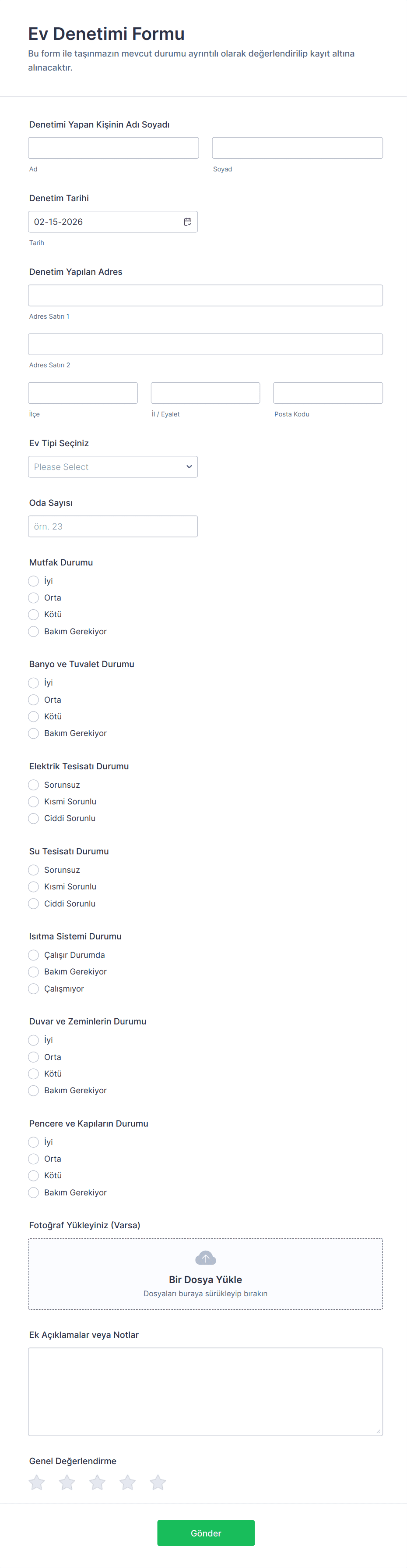 Ev Teftiş Formu, bir denetim sırasında mülkün durumunu kaydetmek için kullanılan yapılandırılmış bir belgedir. Mülkün tüm yönlerinin sistematik olarak değerlendirilmesini ve belgelenmesini sağlar.