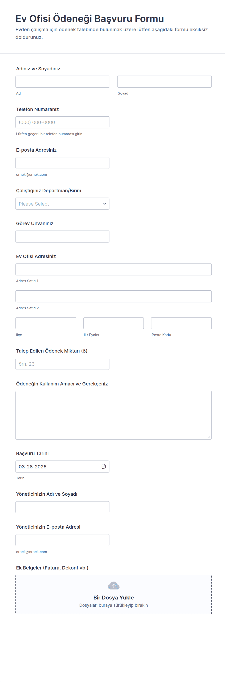 Departman Formları: Departman seçimi, yönetici onay alanları ve harcama limitleri içerebilir.