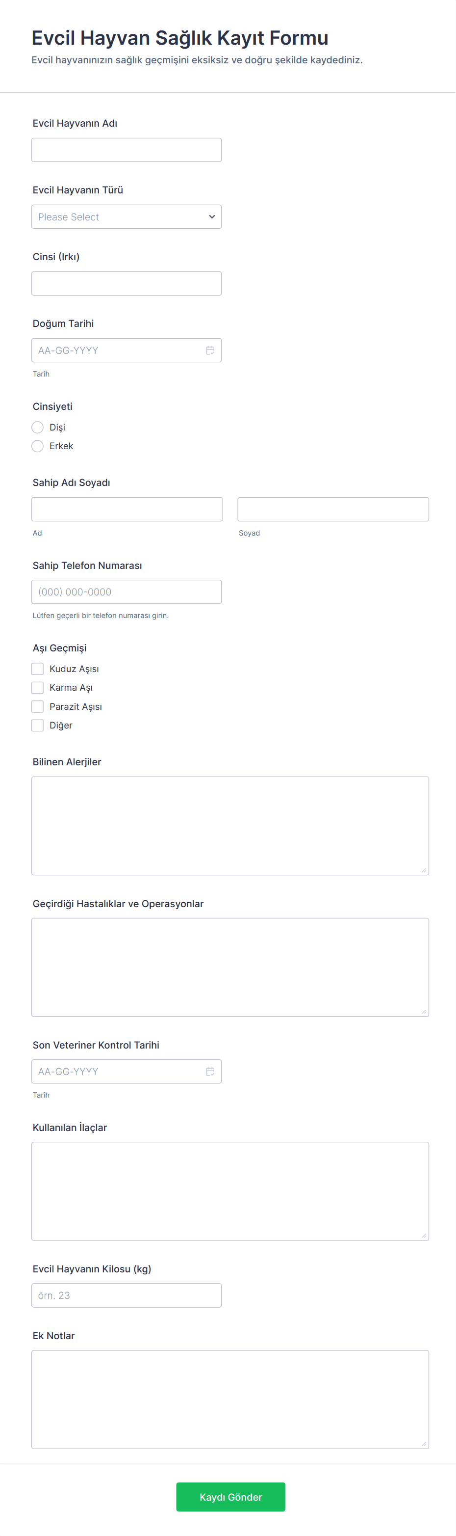 Evcil Hayvan Sağlık Kayıt Formu, evcil hayvanın sağlık geçmişini, aşı durumunu ve önemli notları tek bir kayıt altında toplayarak veteriner klinikleri ve hayvan hizmeti sunan işletmelerin düzenli veri toplama yapmasına yardımcı olur.