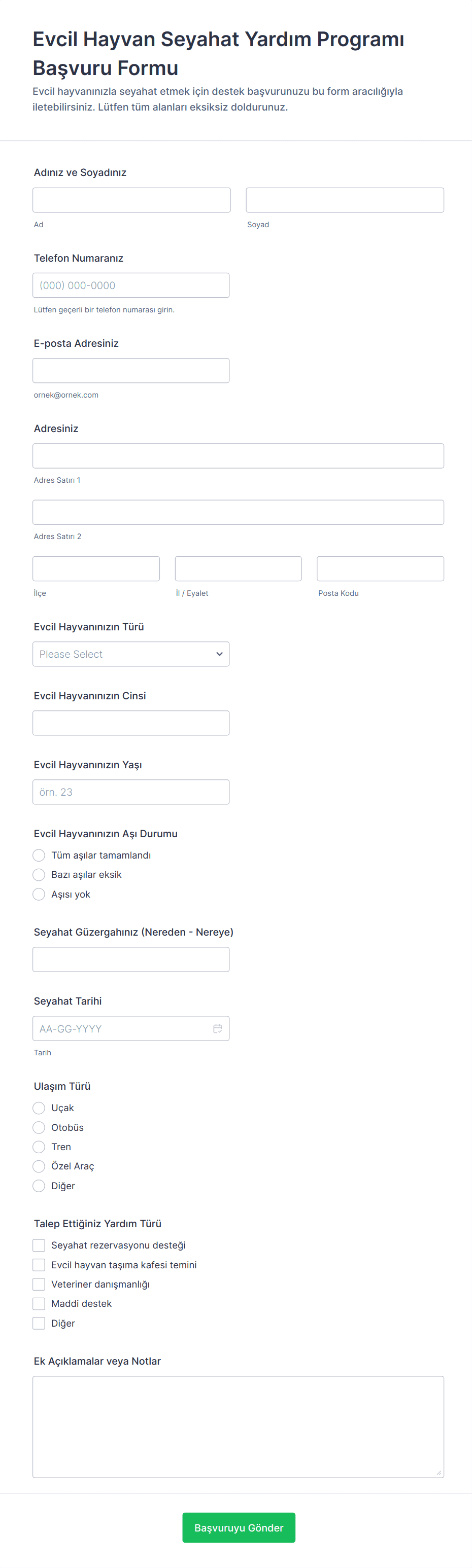 Yaygın kullanılan alanlar arasında kişisel iletişim bilgileri, ev halkı bilgileri, evcil hayvan sahipliği deneyimi, referanslar ve başvuru türüne (sahiplenme, geçici bakım, gönüllülük veya teslim) özel sorular yer alır.