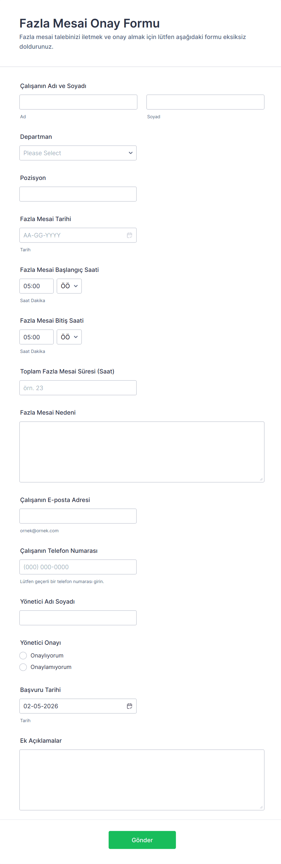 İzin talebi için çalışan adı, departman, izin tarihleri ve izin sebebi gibi alanları ekleyin.