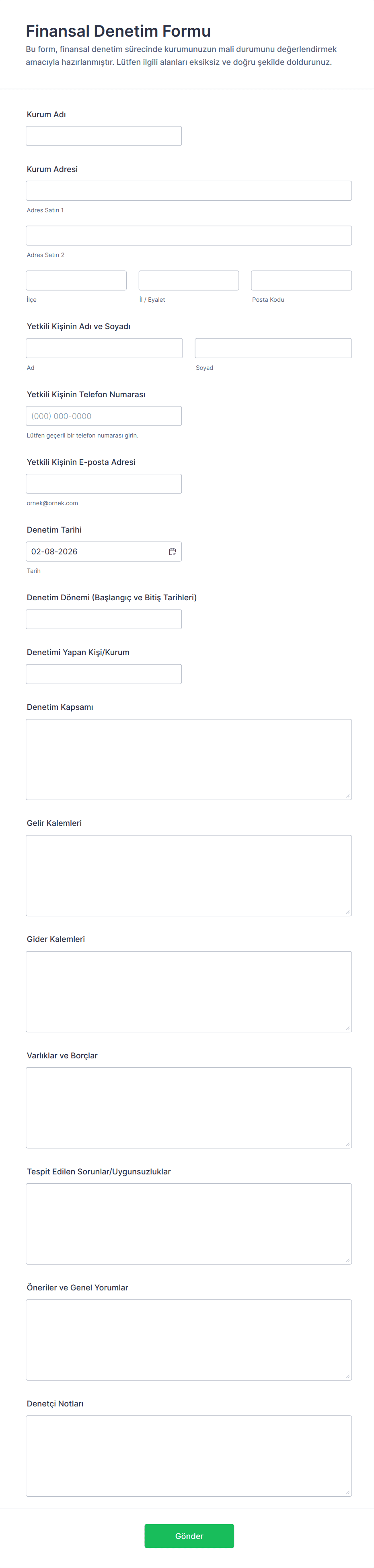 Denetim formu, bir kuruluş içindeki süreçleri, operasyonları veya uyumluluğu sistematik olarak değerlendirmek, incelemek veya gözden geçirmek için kullanılan yapılandırılmış bir belgedir. Denetimler sırasında veri toplama ve raporlamayı standart hale getirmeye yardımcı olur.