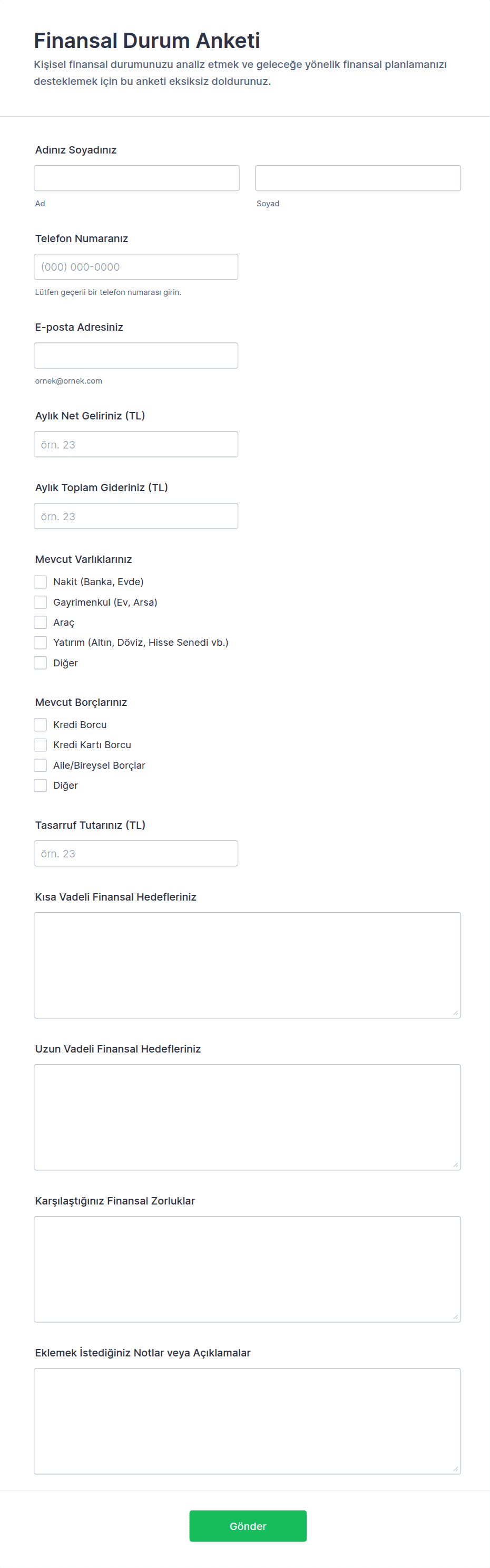 Genel alanlar arasında kişisel bilgiler, finansal hedefler, gelir ve giderler, risk toleransı, yatırım geçmişi ve gerekli yasal açıklamalar bulunur.
