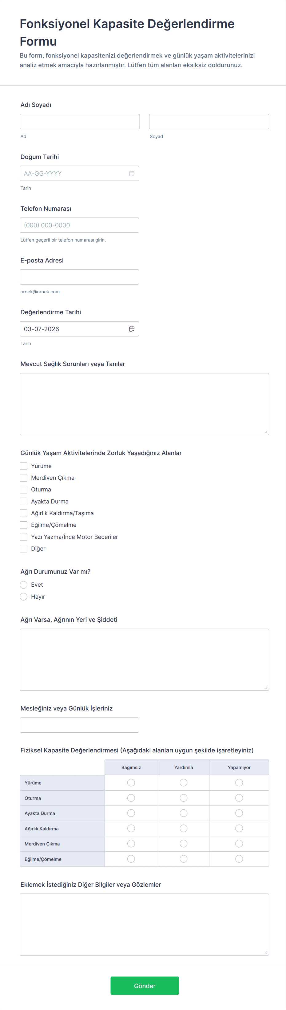 Değerlendirme türüne bağlı olarak belirtiler, tıbbi geçmiş, ilaçlar, alerjiler, yaşam tarzı faktörleri ve fonksiyonel durum için alanlar ekleyin. Şiddet ve etki için derecelendirme ölçekleri kullanın.