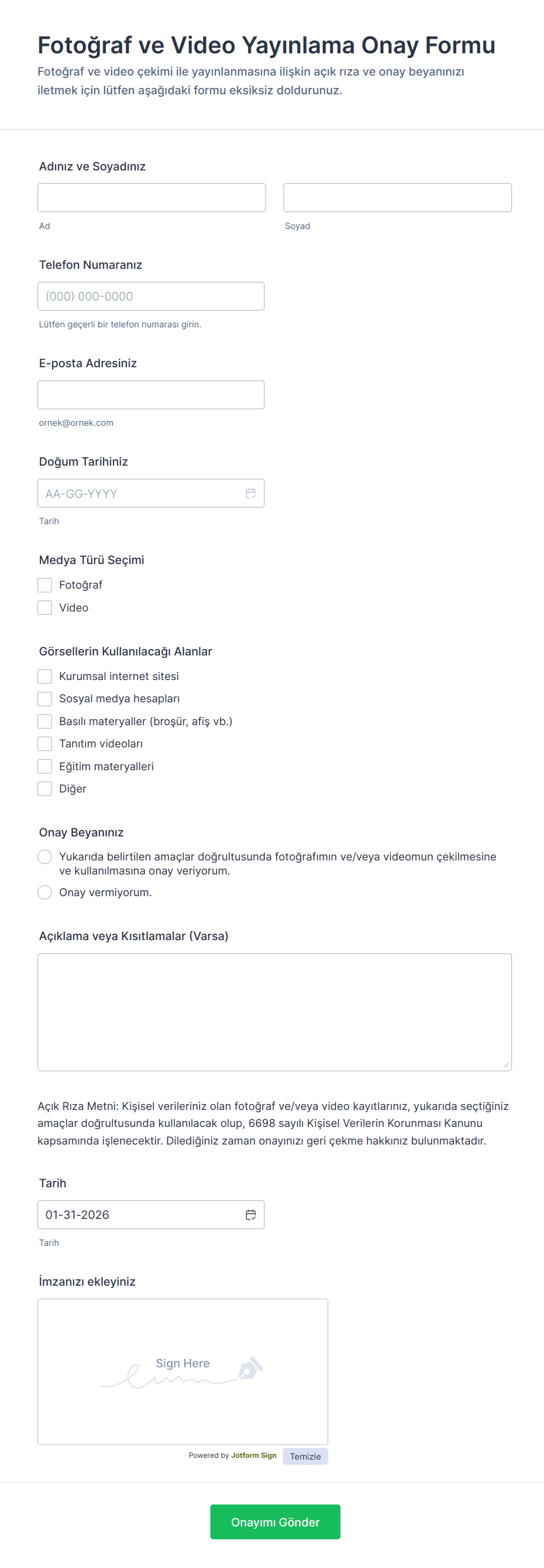 Görseli kullanılacak kişi imzalamalıdır. Eğer kişi reşit değilse, bir ebeveyn veya yasal vasi onay vermelidir.