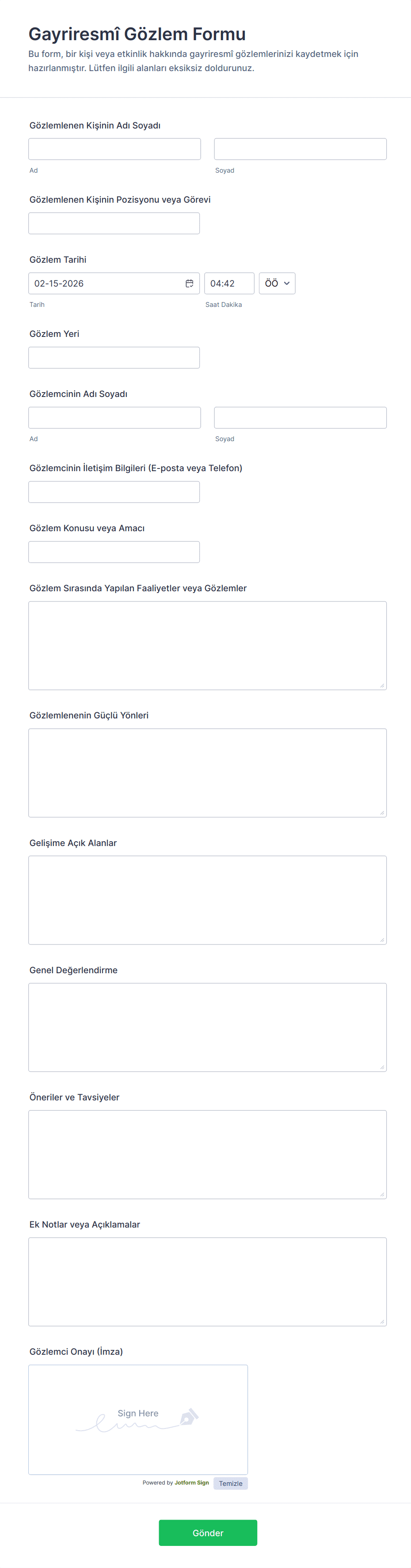 Yaygın kullanılan alanlar arasında derecelendirme ölçekleri, çoktan seçmeli sorular, açık uçlu yorum bölümleri, kontrol listeleri ve bağlama göre bazen demografik veya tanımlayıcı bilgiler bulunur.