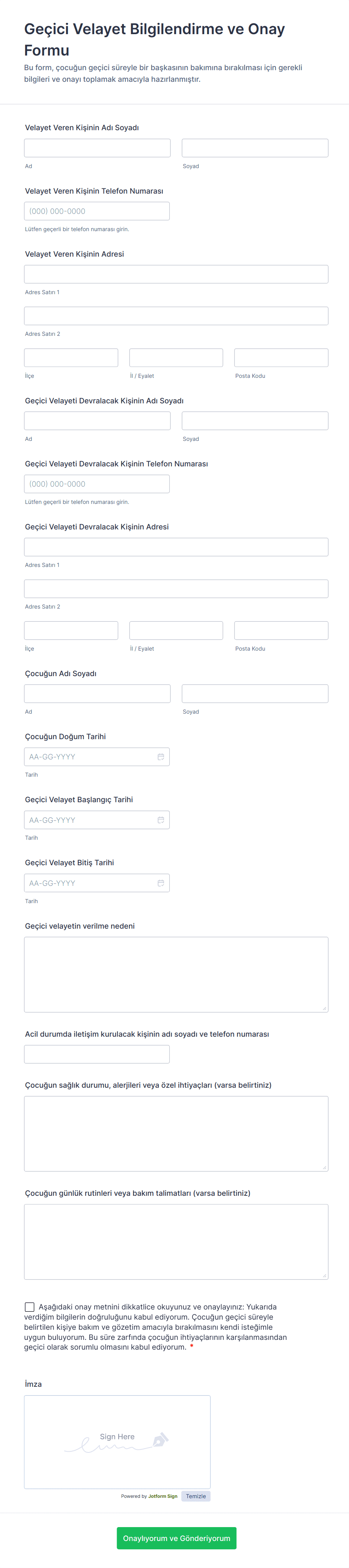 Bu şablonlar yalnızca öneri niteliğindedir. Bu formu veya herhangi bir formu sözleşme veya başka bir yasal belge olarak kullanmadan önce, yasal ihtiyaçlarınızı veya durumunuzu karşıladığından emin olmak için lütfen bir avukata danışın. Bu formu Jotform'a yasal talep göndermek için kullanmayın.