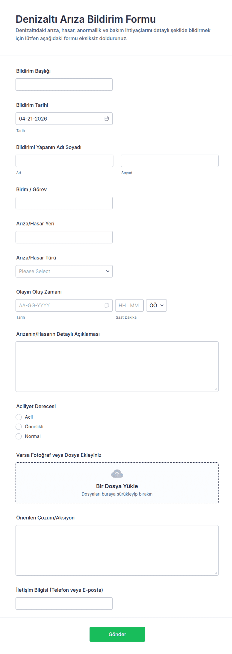 Denizaltı Arıza Bildirim Formu ile arıza ve hasar bildirimlerini tarih ve öncelik bilgileriyle toplayın, ekleri ekleyin ve Jotform üzerinden bakım süreçlerinde veri toplama ve takip işini kolaylaştırın.