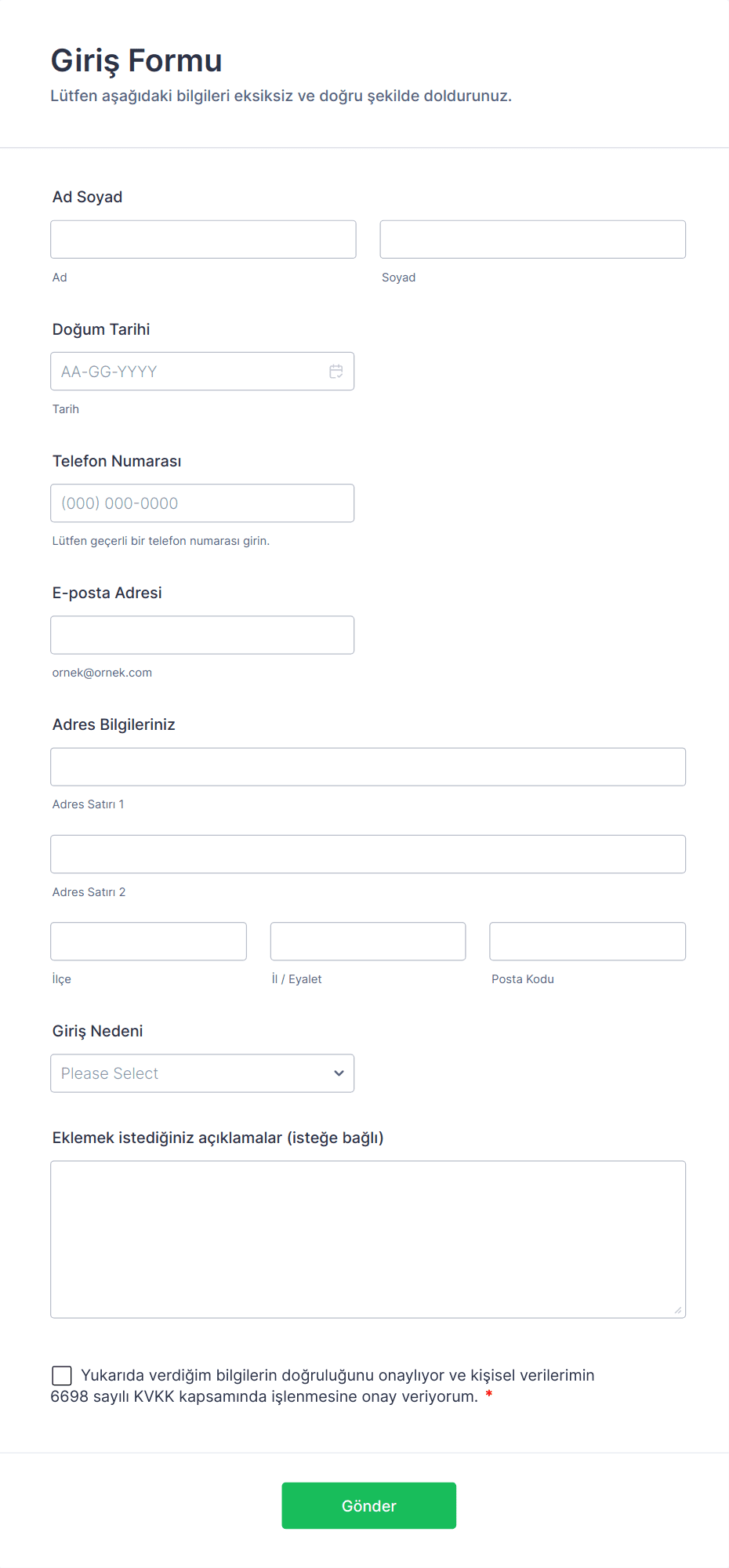 Yaygın alanlar arasında isim, e-posta, telefon numarası, adres ve belirli kullanım durumuna ilişkin tercihler, geribildirim veya onay gibi diğer detaylar bulunur.