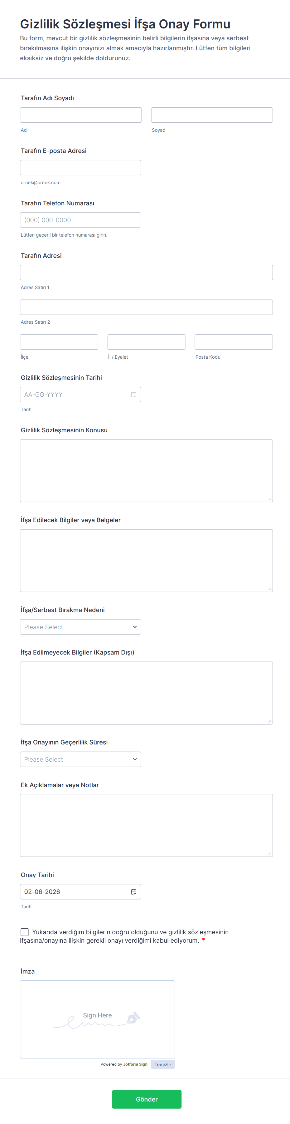 Jotform ile onay formları oluşturmak ve yönetmek sorunsuz bir süreç haline gelir. Jotform'un kodlama gerektirmeyen Form Oluşturucu'su, kullanıcıların hasta kabulü, ebeveyn izinleri veya veri işleme sözleşmeleri gibi özel ihtiyaçlarına yönelik onay formlarını hızlıca tasarlamalarına olanak tanır. Sürükle-bırak arayüzü, özelleştirilebilir şablonlar ve güvenli depolama ve bildirim sistemleriyle entegrasyon, onay yanıtlarını toplamayı, düzenlemeyi ve erişmeyi kolaylaştırır. Kullanıcılar, Jotform'un gelişmiş özelliklerini kullanarak uyumluluğu sağlayabilir, iş akışlarını düzenleyebilir ve hem kuruluşlar hem de yanıtlayanlar için profesyonel bir deneyim sunabilir.