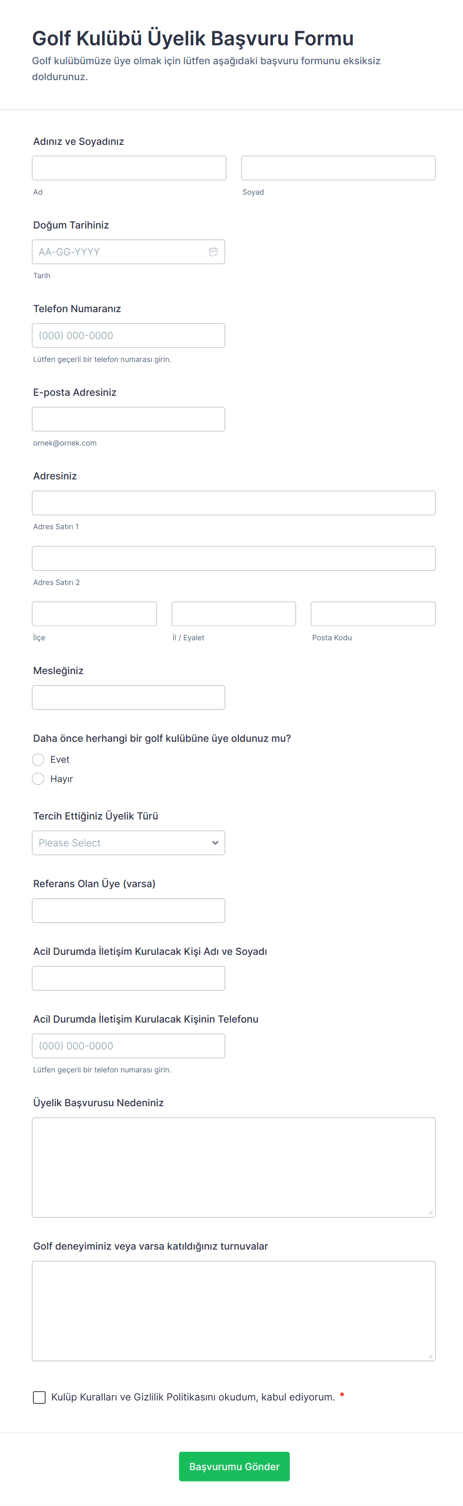 Üyelik Başvuru Formu Şablonları, kuruluşlar, kulüpler, dernekler, spor salonları, sivil toplum kuruluşları ve diğer gruplar tarafından üye olmak isteyen kişilerden temel bilgileri toplamak için kullanılan önceden tasarlanmış dijital formlardır. Bu şablonlar, kişisel bilgileri, iletişim bilgilerini, üyelik tercihlerini, ödeme detaylarını ve onay veya kayıt için gereken diğer ilgili verileri toplayarak işe alım sürecini kolaylaştırır. İster profesyonel bir dernek, spor kulübü, topluluk grubu veya abonelik tabanlı bir hizmet yönetiyor olun, üyelik başvuru formları giriş sürecini standart hale getirmenize ve gerekli tüm bilgileri verimli bir şekilde almanıza yardımcı olur.