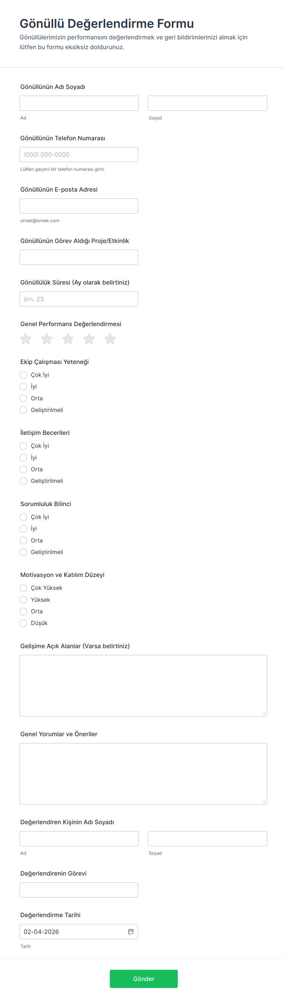 Gönüllü Değerlendirme Formu, kurumların gönüllü performansını düzenli veri toplama ile takip etmesine ve geri bildirim süreçlerini tek noktadan yönetmesine yardımcı olan Jotform form şablonudur.