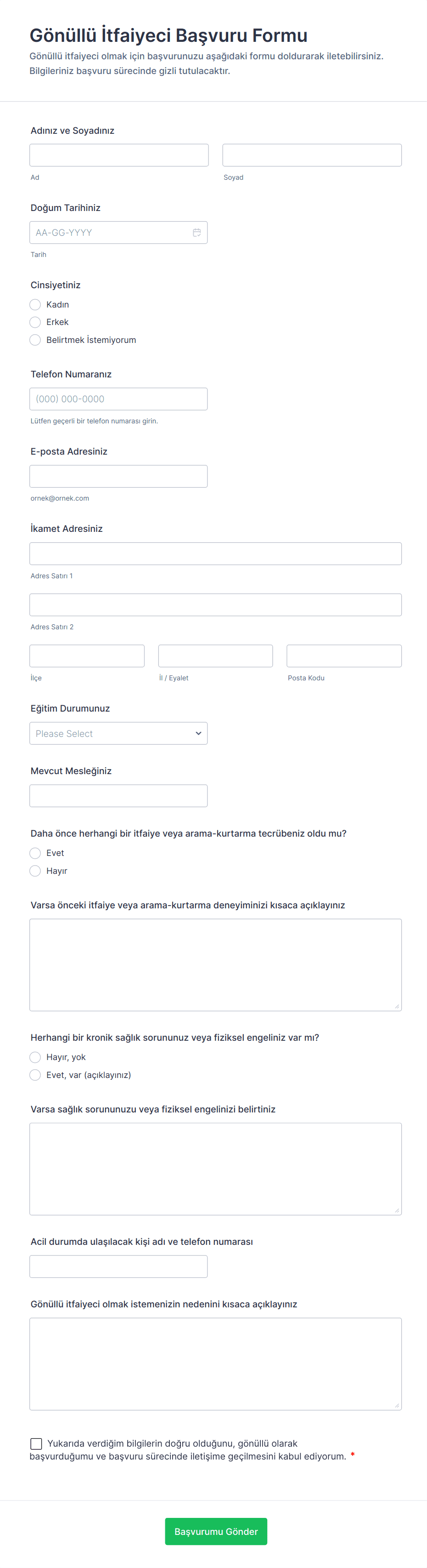 Gönüllü itfaiyeci adaylarından başvuru almak, aday havuzu oluşturmak ve ön değerlendirme için gerekli bilgileri tek bir yerde toplamak amacıyla kullanılır.