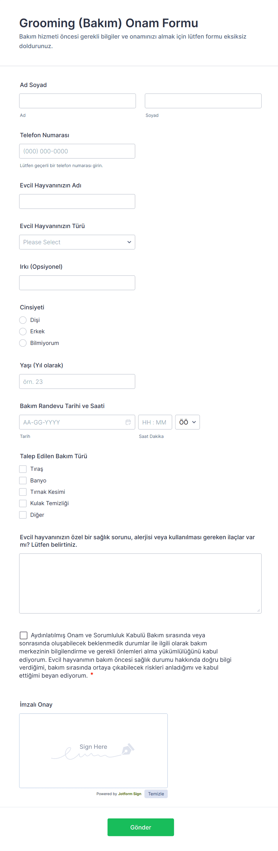 Jotform ile bilgilendirilmiş onam formu oluşturmak, uyumluluk ve profesyonelliği korurken tüm gerekli bilgileri topladığınızdan emin olmanızı sağlayan basit bir süreçtir. İster bir sağlık hizmeti sağlayıcısı, ister bir araştırmacı veya etkinlik organizatörü olun, Jotform'un kullanımı kolay platformu, özel ihtiyaçlarınızı karşılayan formlar tasarlamanıza olanak tanır. Bilgilendirilmiş onam formunuzu özel kullanım durumunuz için optimize etmeye başlamanın yolunu inceleyin: