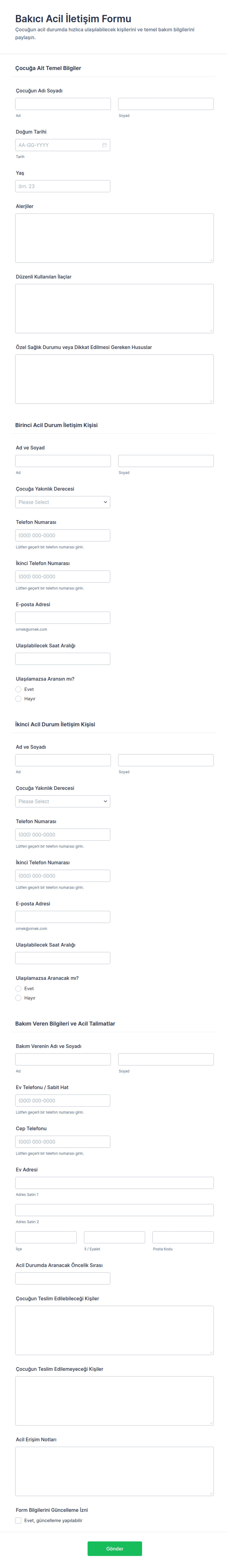 - Okullar: Formlar öğrencilerin sağlık durumlarını, alerjilerini ve birden fazla veli iletişim bilgilerini içerebilir.