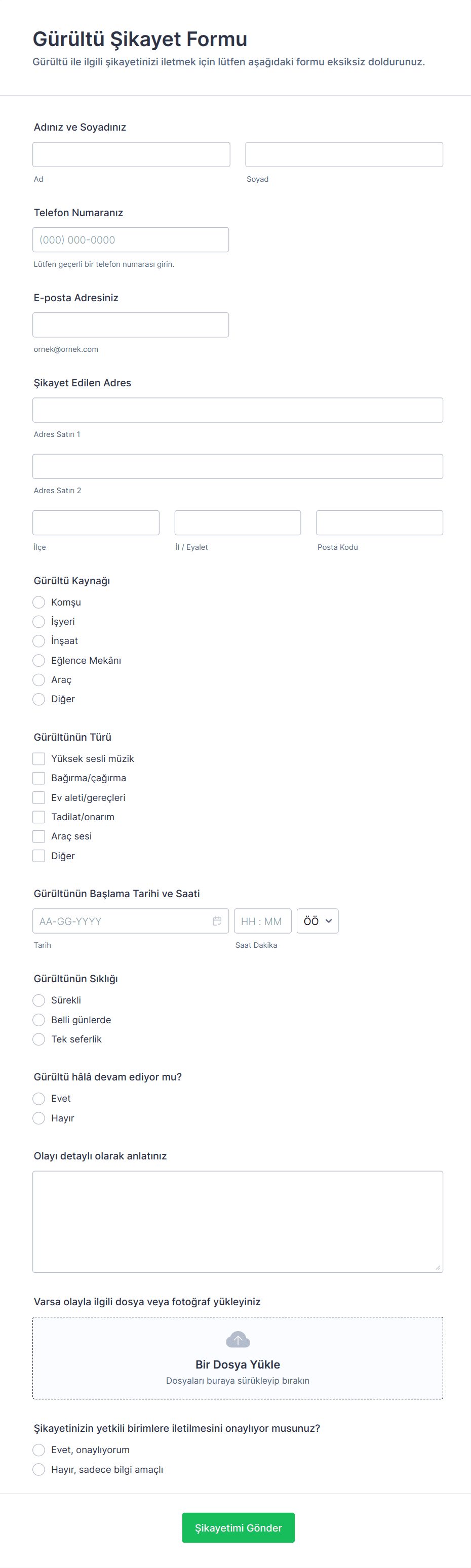 - İçerik ve Alanlar: Gerekli bilgiler bağlama göre değişebilir. Örneğin, bir müşteri şikayet formu sipariş detaylarını ve ürün bilgilerini içerebilirken, bir çalışan şikayet formu departman ve yönetici bilgilerini gerektirebilir.