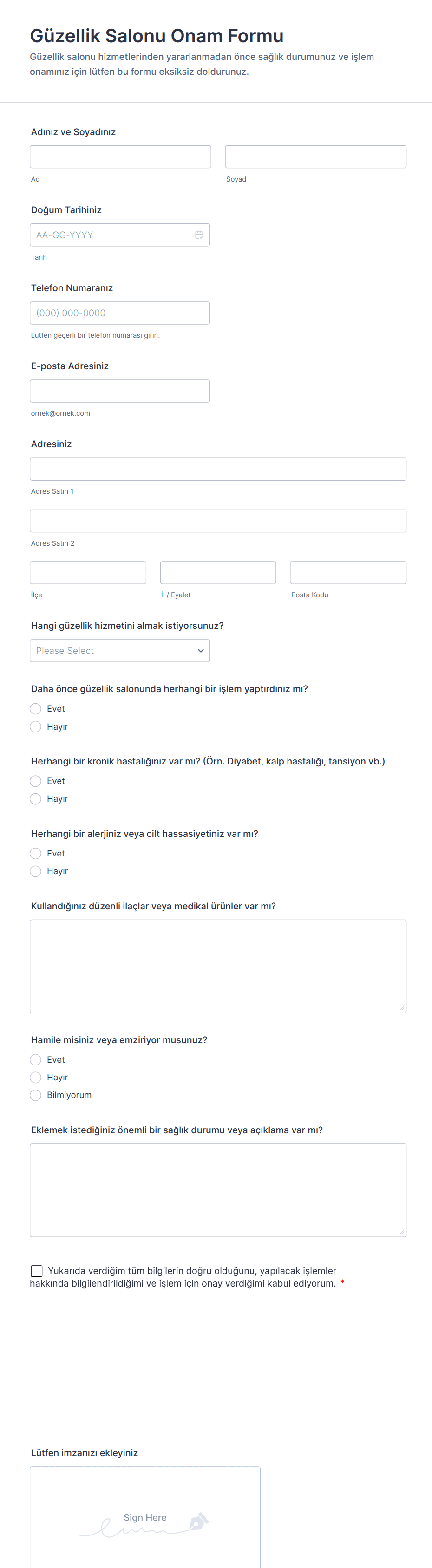 - Tıbbi onam formları, detaylı risk açıklamaları, acil durum iletişim alanları ve HIPAA uyumluluk beyanları gerektirebilir.