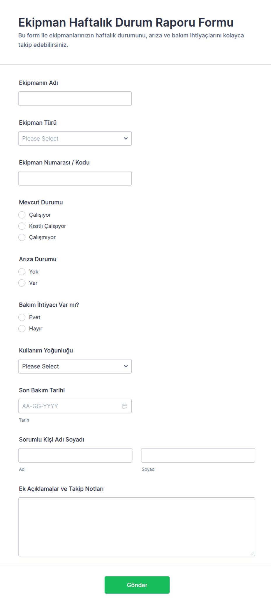 Ekipman Haftalık Durum Raporu Formu