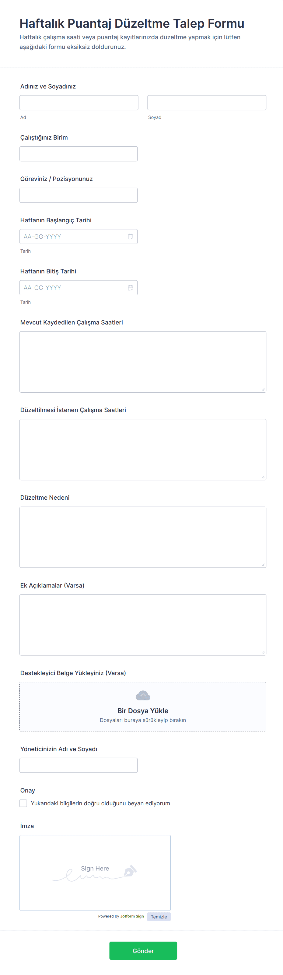 Haftalık Puantaj Düzeltme Talep Formu ile çalışanlardan puantaj düzeltme taleplerini toplayın, inceleme ve onay süreçlerini netleştirin ve Jotform ile veri toplama akışını tek noktadan yönetin.