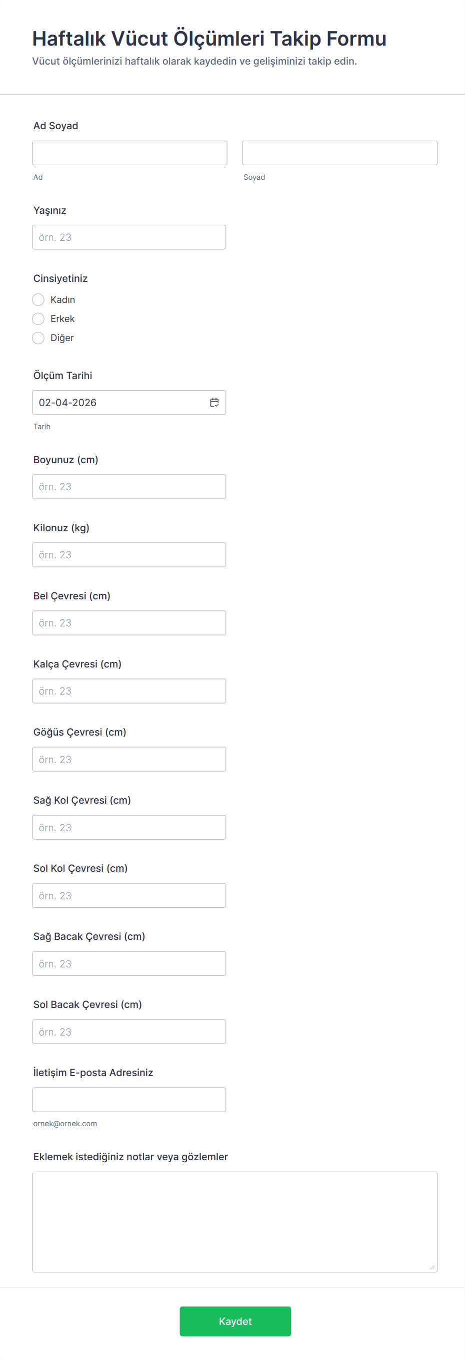 Sağlık Takip Formu, belirli bir süre boyunca semptomlar, ilaçlar, egzersiz veya beslenme gibi çeşitli sağlıkla ilgili verileri kaydetmek ve izlemek için kullanılan dijital bir belgedir. Bireylerin ve sağlık hizmeti sağlayıcılarının sağlık eğilimlerini takip etmelerine ve bilinçli kararlar vermelerine yardımcı olur.