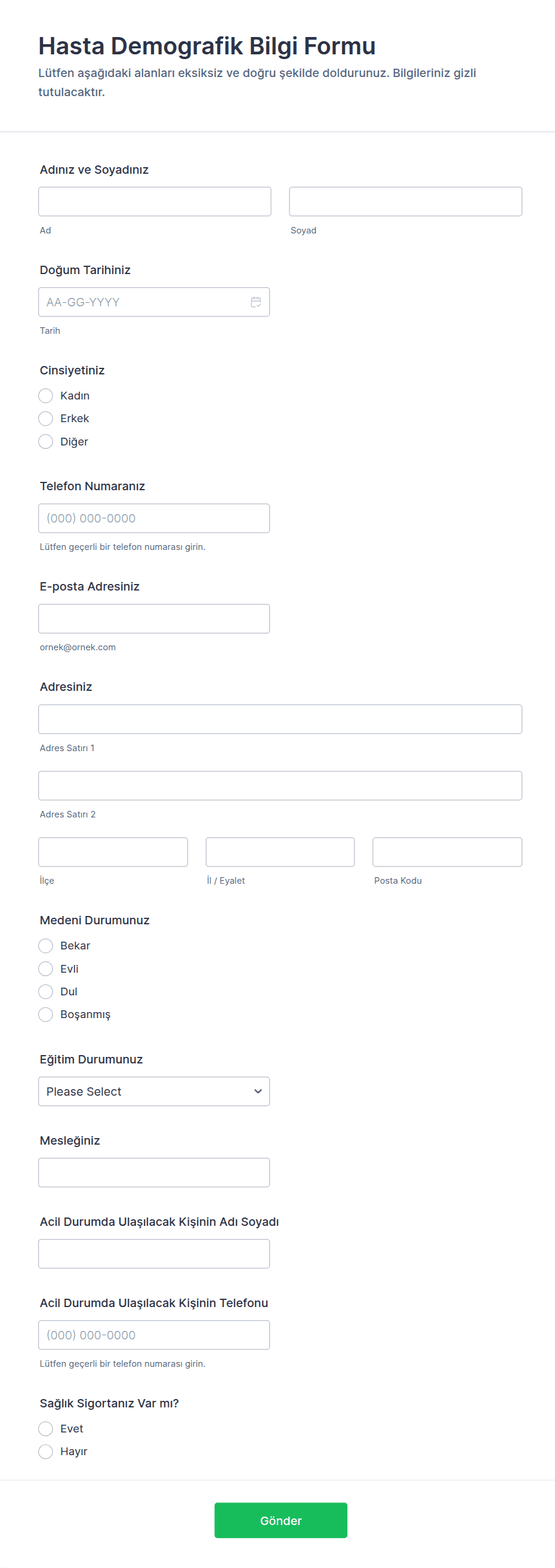 Bu adımları takip ederek, ister yüz yüze ister online olsun, hasta kabul sürecinizi kolaylaştıran, hataları azaltan ve hasta deneyimini iyileştiren güvenli, kullanımı kolay bir Hasta Kayıt Formu oluşturabilirsiniz.