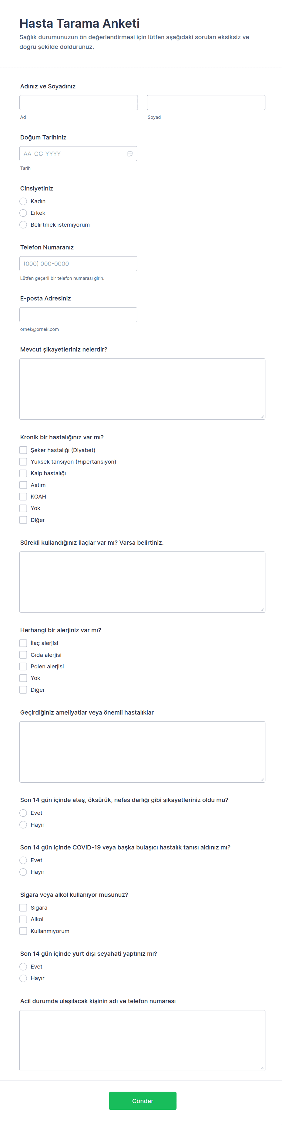 Sağlık Anketleri ve Araştırma Formları, sağlık uzmanları, araştırmacılar, klinikler ve kuruluşlar tarafından hastaların sağlığı, tıbbi geçmişleri, semptomları, tedavi sonuçları ve genel sağlık durumları hakkında değerli bilgiler toplamak için kullanılan önemli araçlardır. Bu formlar; hasta kabulü, sağlık riski değerlendirmeleri, memnuniyet anketleri, ruh sağlığı taramaları, ziyaret sonrası geri bildirimleri ve klinik araştırma çalışmaları gibi çeşitli amaçlar için kullanılabilir. Doğrudan hastalardan veya çalışma katılımcılarından yapılandırılmış veriler toplayarak, tıbbi anketler ve bireysel anketler iş akışlarını düzenlemeye, hasta bakımını iyileştirmeye ve sağlık ortamlarında kanıta dayalı karar vermeyi desteklemeye yardımcı olur.