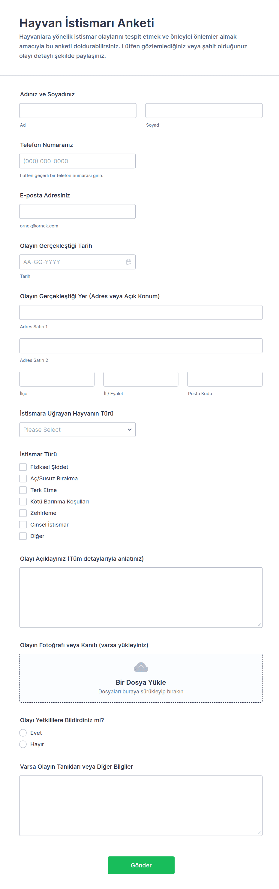 Hayvan İstismarı Anket Formu, şüpheli hayvan istismarı olaylarını tarih, konum ve kanıtlarla birlikte toplayıp değerlendirmek isteyen sivil toplum kuruluşları, barınaklar ve kurumlar için hızlı veri toplama sağlar.
