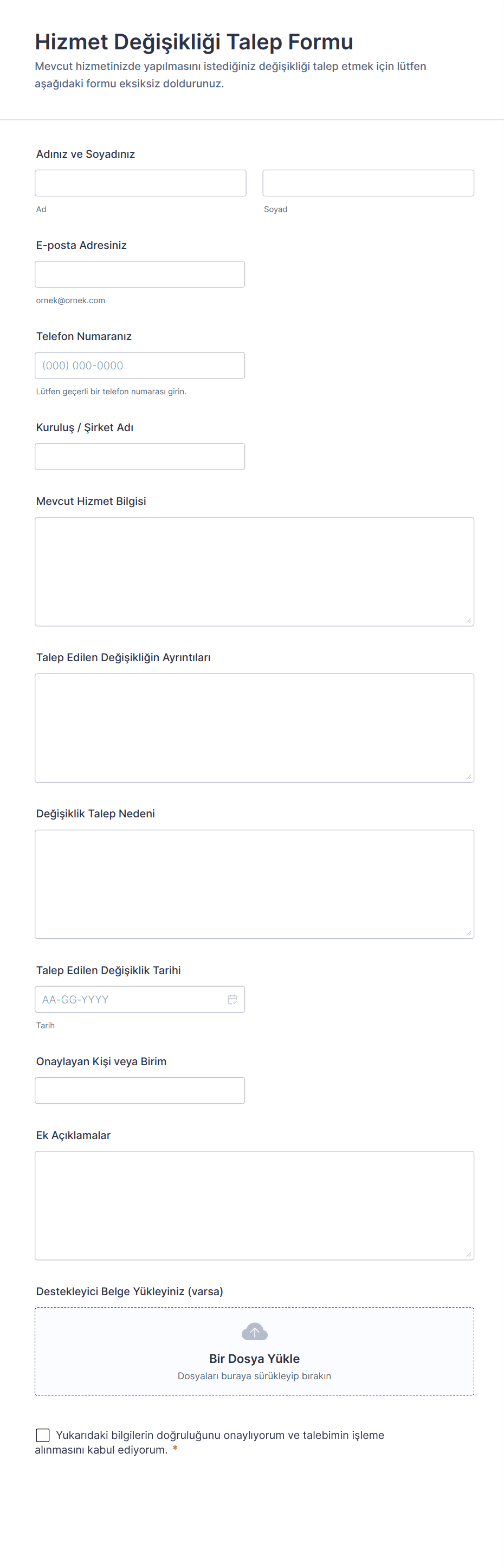 Yaygın kullanılan alanlar alanlar arasında talep eden kişinin bilgileri (ad, iletişim bilgileri), talep türü, açıklama veya gerekçe, öncelik seviyesi, destekleyici belgeler ve ilgili tarihler veya son tarihler bulunur.