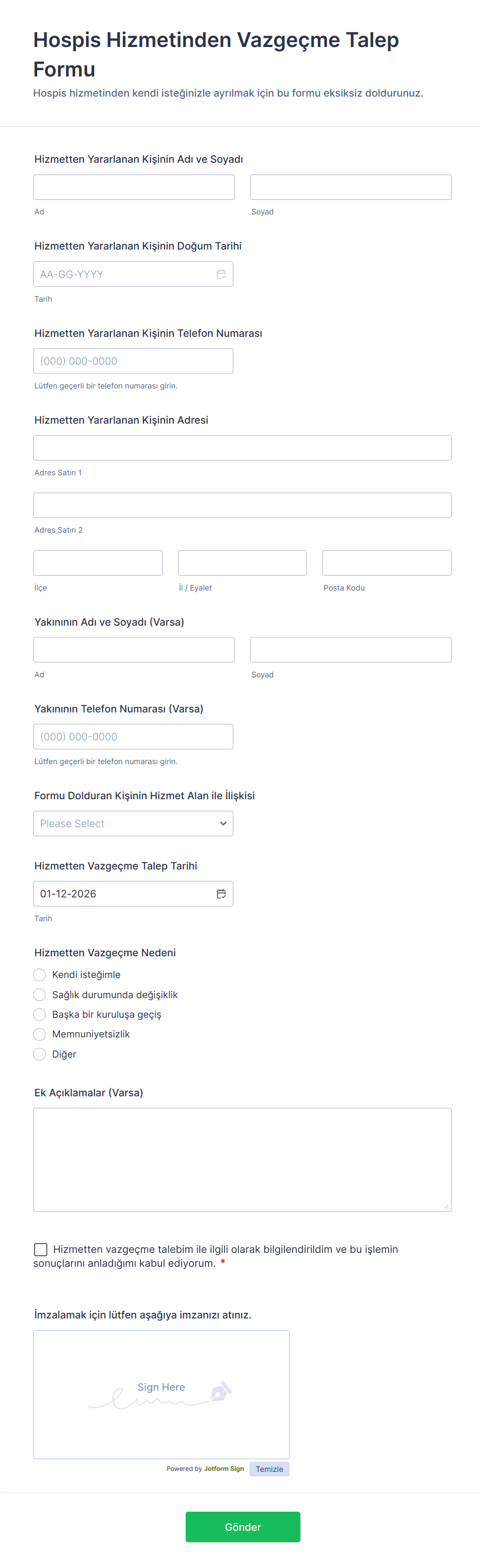 Bakımevi ve palyatif bakım için hastaları kaydetmek amacıyla ücretsiz Bakımevi Formlarımızı kullanın. İster bireysel bir kullanıcı olun ister bir sağlık hizmeti sağlayıcısı, güvenli online formlarımız, iletişim bilgileri, e-imzalar, dosya yüklemeleri, sağlık verileri ve COVID-19 tarama bildirimleri gibi önemli hasta bilgilerini hızlıca toplamanızı sağlar. Tüm yanıtlar Jotform hesabınızda depolanır ve 256-bit SSL bağlantısı, PCI uyumluluğu ve isteğe bağlı HIPAA uyumlu özellikler ile korunur.