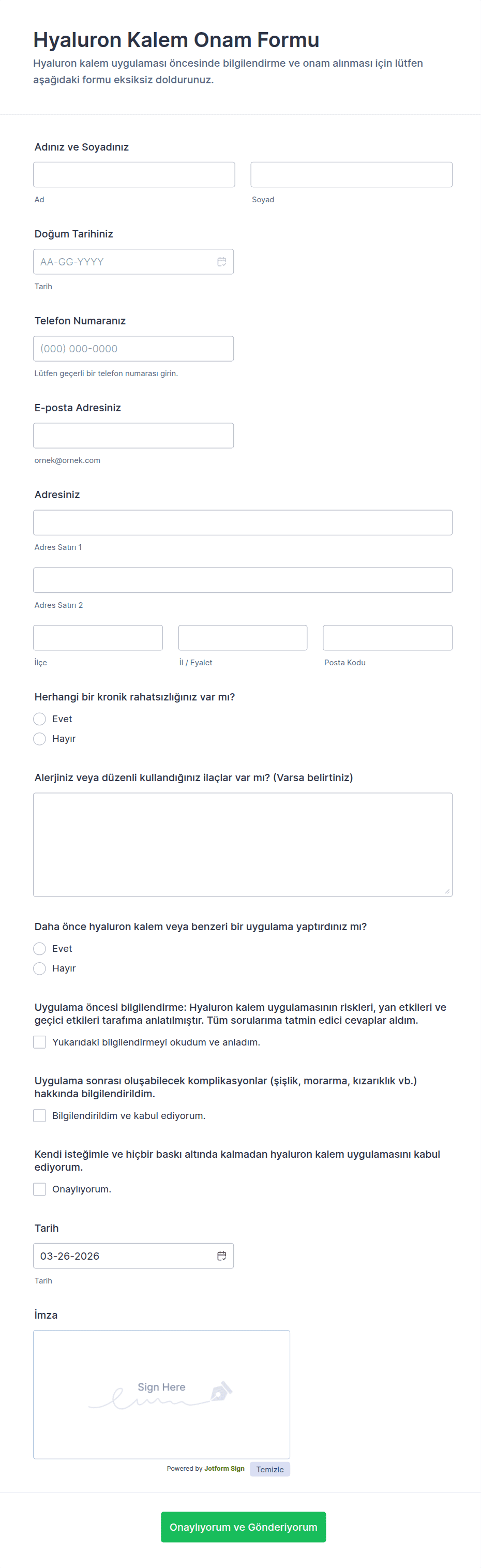 - Tıbbi onam formları, detaylı risk açıklamaları, acil durum iletişim alanları ve HIPAA uyumluluk beyanları gerektirebilir.
