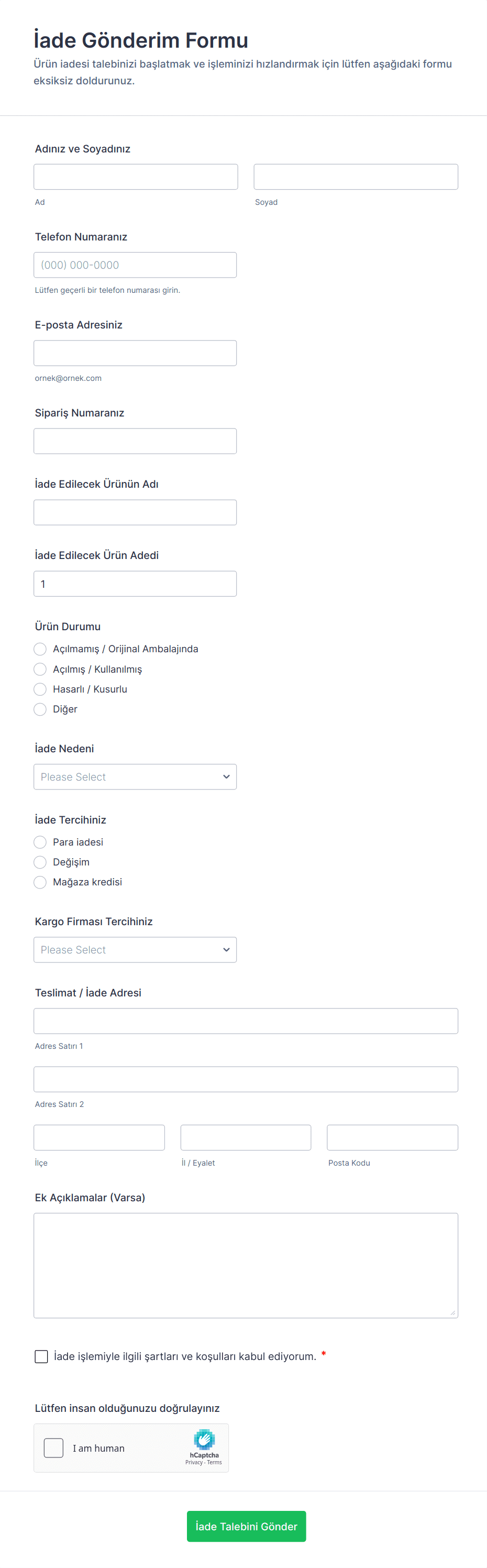 İade formları, iade sürecini standartlaştırır, manuel hataları azaltır ve gerekli tüm bilgilerin önceden toplanmasını sağlayarak, iade taleplerinin daha hızlı ve daha doğru işlenmesine olanak tanır.