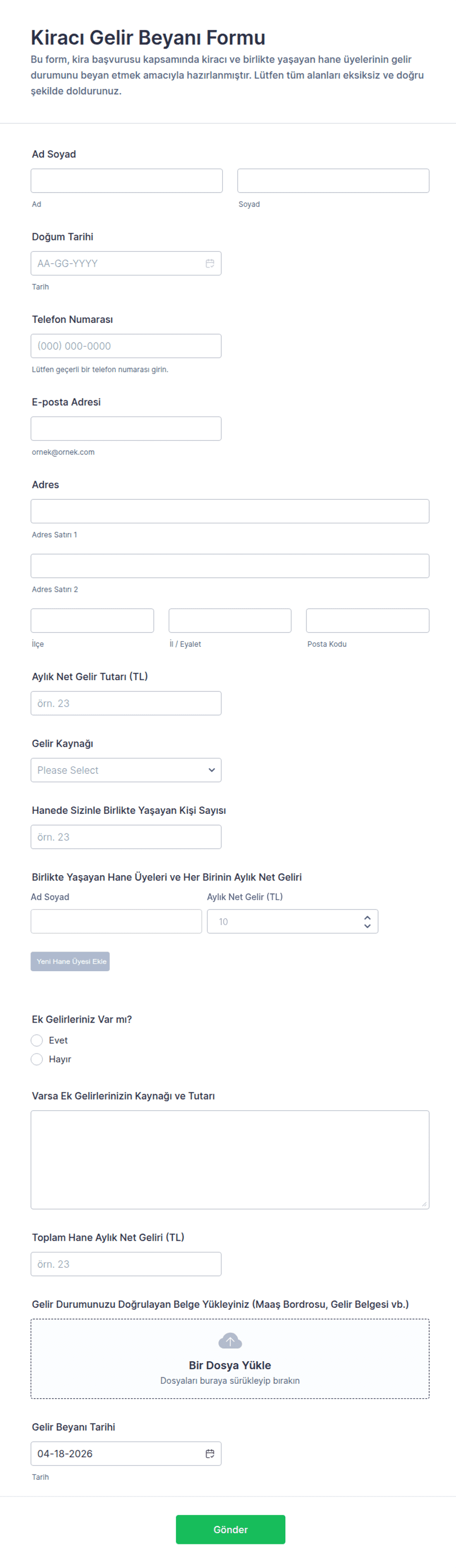 Kiracı başvuru formu, ev sahipleri veya emlak yöneticileri tarafından potansiyel kiracıların bir mülkü kiralamaya uygunluğunu değerlendirmek üzere kişisel bilgiler, kiralama geçmişi, istihdam ve referanslar gibi bilgileri toplamak için kullanılan bir belgedir.