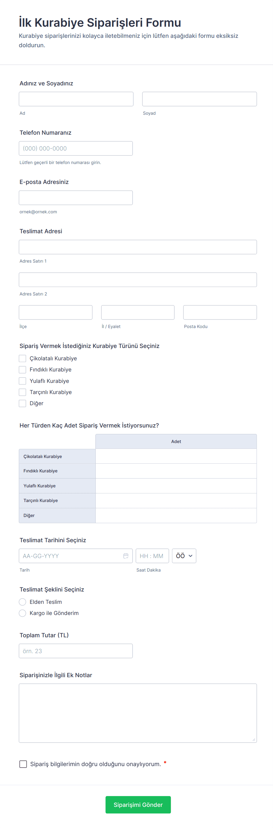 - Kurumsal Hediyeleşme: Şirketler, çalışan hediyeleri veya müşteri takdiri için toplu kurabiye siparişlerini düzenlemek üzere bu formları kullanabilir.