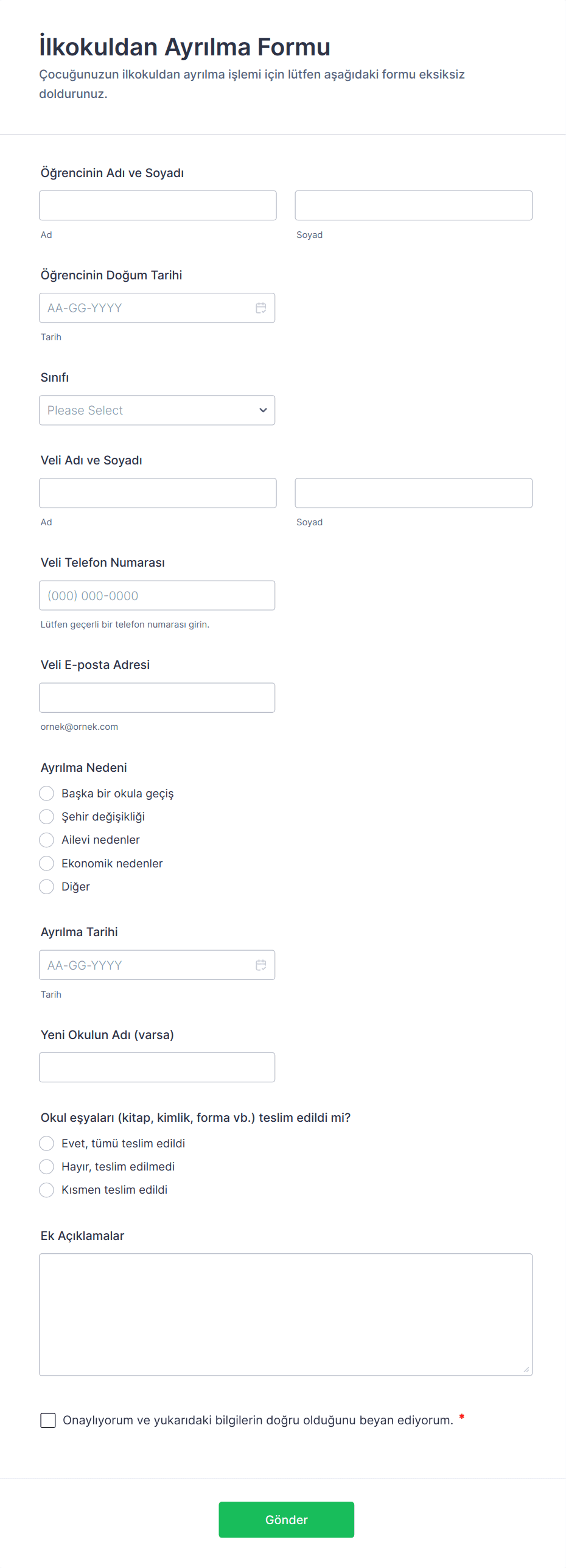 Öğrenci Onay Formu, okulların ve eğitim kurumlarının velilerden etkinlik, faaliyet ve uygulama katılım onaylarını dijital olarak toplamasına ve düzenli biçimde arşivlemesine yardımcı olur.